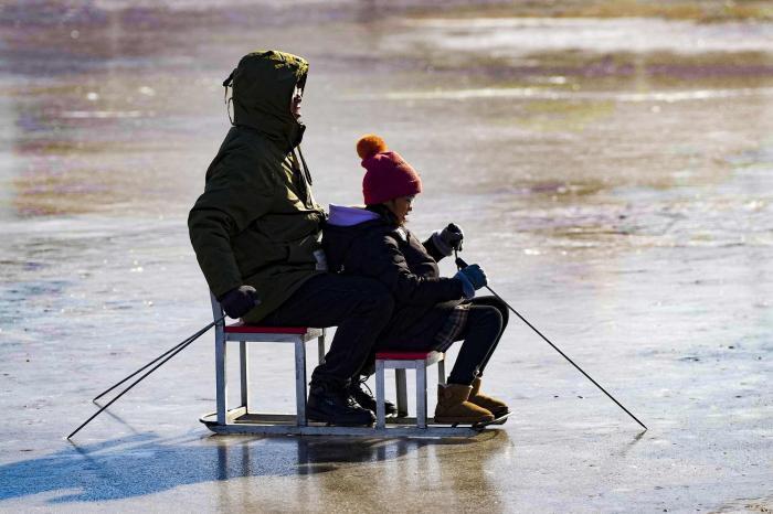 小一又友推着坐冰车的大东说念主滑行。