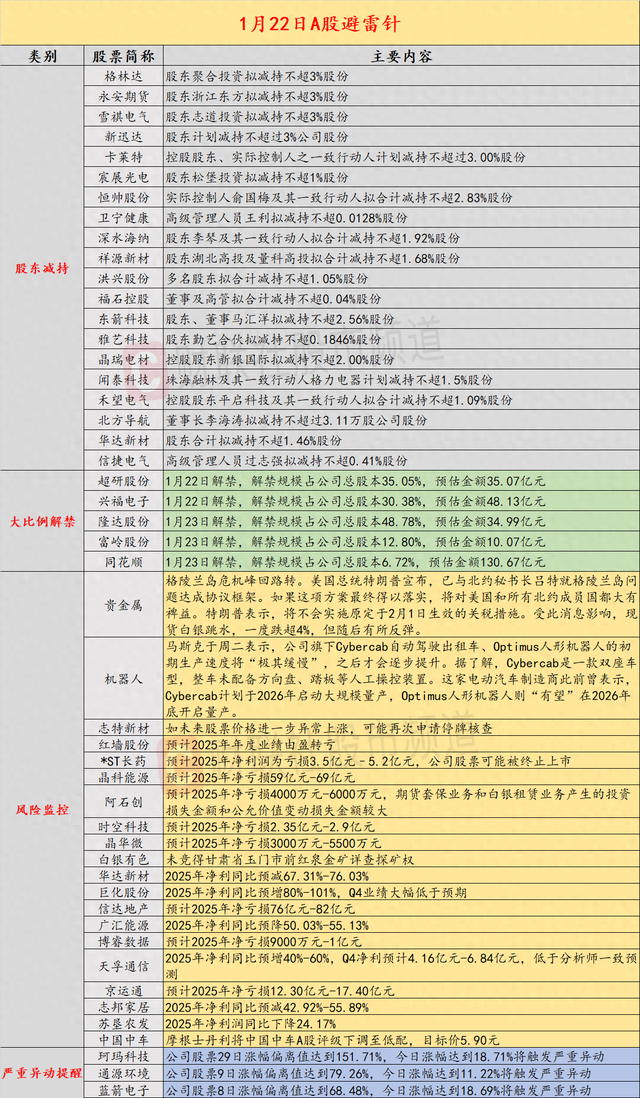导读:财联社1月22日投资避雷针,近日,A股及国际市集潜在风险事件如下。国内经济信息方面包括:1)入款利率继续下调,部分银行大额存单利率跌入“0字头”;2)第四批中成药集采在品种障翳上扬弃要紧冲破,独家家具与OTC或大限制纳入;公司方面重心柔柔包括:1)志特新材暗意,如明天股票价钱进一步尽头高潮,可能再次肯求停牌核查;2)2连板红墙股份瞻望2025年年度事迹由盈转亏;国际市集重心柔柔包括:1)马斯克称,Cybercab与Optimus初期量产将极其稳固;2)格陵兰岛危急峰回路转,现货白银跳水。