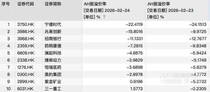 按折价率幅度排行,共包括宁德期间、招商银行、药明康德、恒瑞医药、兆易翻新、好意思的集团、潍柴能源、澜起科技8家公司。而在2月23日,三一重工和紫金矿业分裂出现了-0.23%和-5.27%的AH价差,使得倒挂公司的数目一霎达到10家,但均在2月24日还原为恰巧。
